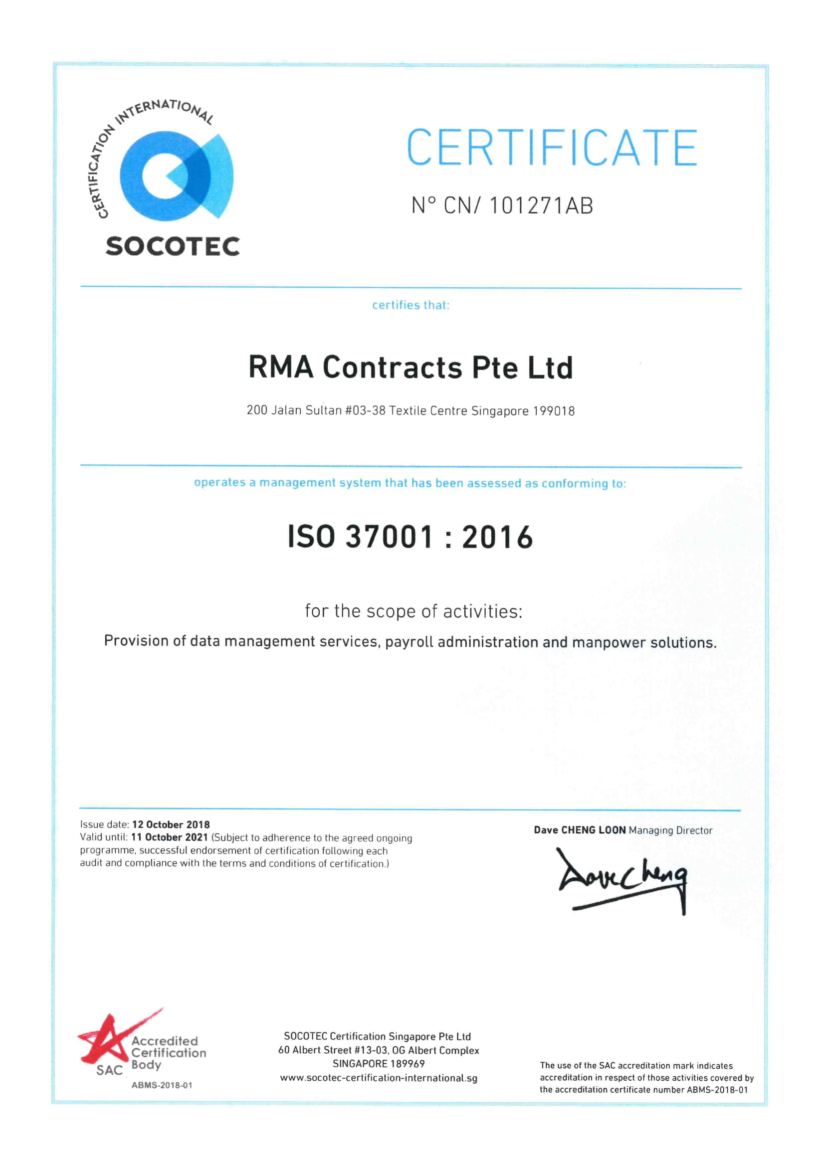 Our processes at RMA Group are certified as Evidence Act by PwC and are compliant with ISO 9001, 14001, 20000-1, 22301, 27001, 37001, 45001 and SS 584:2015. These accreditations are proof of our commitment to providing high-quality business process outsourcing solutions. Click on one of our certifications below to find out more.